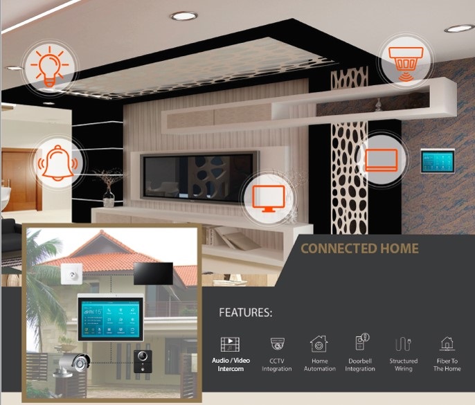 The standard range of features and capability include:- Smart Phone Control , Lift Control from House, Alarm Detection, Kitchen Gas/Fire Sensor and Sending notification to phone and BMS, CCTV Monitoring & ONVIF Video Recording, Access Control Digital Door Lock, Apartment Door & Lift Lobby Station (Building Video Entry Station) Integration. Support up to 4 home phones i.e. Audio Intercom, Living Dining Area, Standard IP Phone in Bedroom and Common Area.